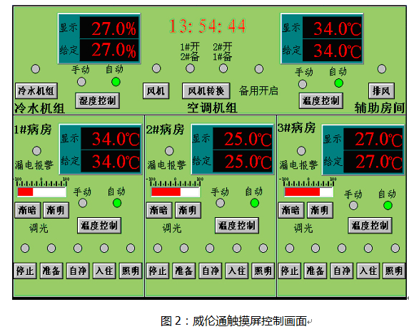主要功能:溫度、濕度的實(shí)時(shí)顯示;在自動(dòng)控制情況下用戶可設(shè)定溫濕度的給定值;在觸摸屏上用戶可以做以下操作:溫濕度控制方式的切換;空調(diào)機(jī)組風(fēng)機(jī)轉(zhuǎn)換;冷水機(jī)組、排風(fēng)機(jī)、風(fēng)機(jī)的啟停;調(diào)光亮度控制;病房指示燈的開關(guān)??梢杂^察到各個(gè)設(shè)備的工作狀態(tài)。