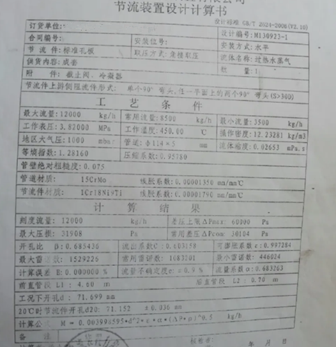 4、根據(jù)孔板計算書中數(shù)據(jù),流量采用的是減壓前的中壓蒸汽的溫度、壓力及相關(guān)參數(shù)進行的計算,最大差壓60kpa,最大流量12000m3/h。