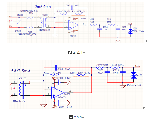 前端采樣電路如圖2.2.1和圖2.2.2所示,電壓電流采樣選用高精度電壓電流互感器,其體積小、精度高、全封閉、隔離耐壓能力強(qiáng)?;ジ衅鲗㈦妷弘娏鬓D(zhuǎn)換為小信號(hào)后,經(jīng)二階低通濾波送至AD芯片進(jìn)行轉(zhuǎn)換。AD芯片選用高精度16位AD芯片ADS8568SPMR,基準(zhǔn)電壓2.5V,8通道同步采樣,轉(zhuǎn)換速率滿足系統(tǒng)對快速采樣轉(zhuǎn)換的需求,且信噪比達(dá)到91.5dB。