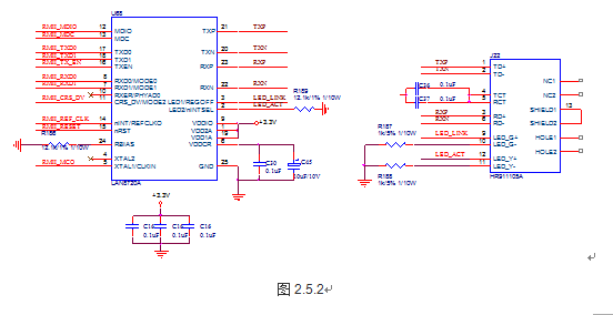以太網(wǎng)通信接口采用片上以太網(wǎng)外設(shè)通過簡化介質(zhì)獨(dú)立接口 (RMII)和外部快速物理層LAN8720A芯片實(shí)現(xiàn),RJ45接口內(nèi)部集成了1:1變比的信號(hào)變壓器,實(shí)現(xiàn)信號(hào)的隔離保護(hù),提高通訊的抗干擾性能,具體實(shí)現(xiàn)原理如圖2.5.2所示。