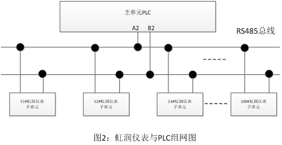 考慮到100臺儀表在RS485總線上的實時性、有效性、正確性,現(xiàn)將100臺虹潤NHR系列智能控制儀表通訊組網(wǎng)分為兩條總線,分別由PLC的串口擴展口分別定義為A1、B1和A2、B2 ;下面是虹潤NHR系列智能控制儀表與PLC主機連接圖,見圖1、圖2: