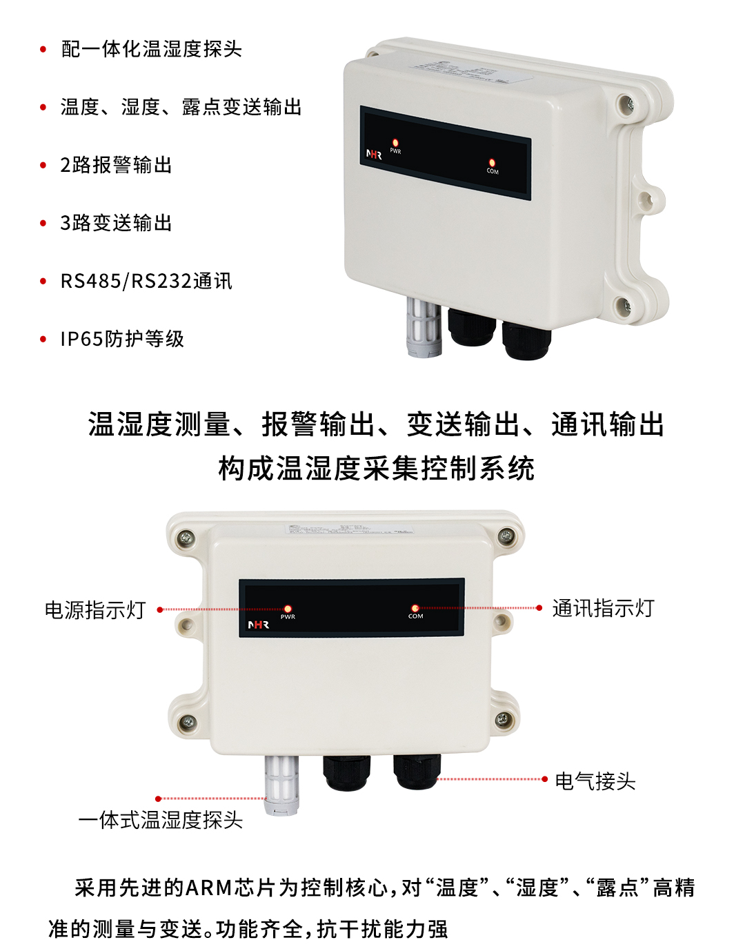 虹潤公司是專業(yè)生產(chǎn)環(huán)境監(jiān)測儀表的國家專精特新“小巨人”企業(yè)。生產(chǎn)的一體式溫濕度變送器,具有溫度、濕度、露點(diǎn)高精準(zhǔn)的測量與變送,報(bào)警繼電器輸出,RS485/RS232通訊,IP65防護(hù)等級等特點(diǎn)。產(chǎn)品獲得一種手持式低功耗溫濕度檢測儀、大屏幕溫濕度記錄儀等2項(xiàng)國家發(fā)明專利,主持起草物聯(lián)網(wǎng)智能溫度儀表通用技術(shù)條件、冷鏈溫度記錄儀等2項(xiàng)國家標(biāo)準(zhǔn),以及通信系統(tǒng)多通道數(shù)據(jù)采集控制終端規(guī)范軍用標(biāo)準(zhǔn),以及現(xiàn)場設(shè)備集成等5項(xiàng)智能制造國家標(biāo)準(zhǔn),參與國際5G標(biāo)準(zhǔn)制定,取得溫濕度儀表等3項(xiàng)相關(guān)軟件著作權(quán)。產(chǎn)品廣泛應(yīng)用于工業(yè)現(xiàn)場、農(nóng)業(yè)大棚、倉儲(chǔ)物流、地下管廊、養(yǎng)殖孵化、配電機(jī)房等諸多領(lǐng)域。