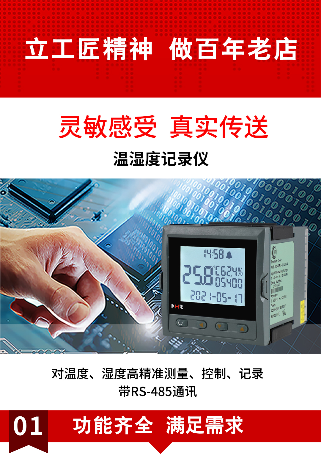虹潤(rùn)公司是專(zhuān)業(yè)生產(chǎn)環(huán)境監(jiān)測(cè)儀表的國(guó)家專(zhuān)精特新“小巨人”企業(yè)。生產(chǎn)的盤(pán)裝式溫濕度記錄儀,具有溫度、濕度、露點(diǎn)高精準(zhǔn)的測(cè)量,數(shù)據(jù)記錄與轉(zhuǎn)存,配上位機(jī)軟件,繼電器/蜂鳴器雙報(bào)警,帶RS485/RS232通訊輸出等級(jí)等特點(diǎn)。產(chǎn)品獲得一種手持式低功耗溫濕度檢測(cè)儀、大屏幕溫濕度記錄儀等2項(xiàng)國(guó)家發(fā)明專(zhuān)利,主持起草物聯(lián)網(wǎng)智能溫度儀表通用技術(shù)條件、冷鏈溫度記錄儀等2項(xiàng)國(guó)家標(biāo)準(zhǔn),通信系統(tǒng)多通道數(shù)據(jù)采集控制終端規(guī)范軍用標(biāo)準(zhǔn),以及現(xiàn)場(chǎng)設(shè)備集成等5項(xiàng)智能制造國(guó)家標(biāo)準(zhǔn),參與國(guó)際5G標(biāo)準(zhǔn)制定,取得溫濕度儀表等2項(xiàng)相關(guān)軟件著作權(quán)。產(chǎn)品廣泛應(yīng)用于工業(yè)現(xiàn)場(chǎng)、農(nóng)業(yè)大棚、倉(cāng)儲(chǔ)物流、地下管廊、養(yǎng)殖孵化、配電機(jī)房等諸多領(lǐng)域。