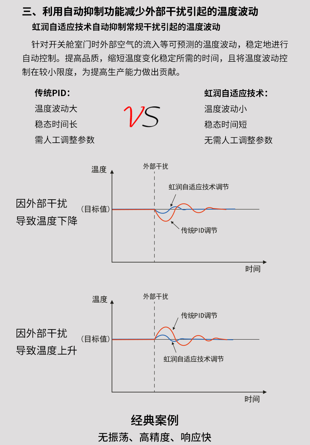 虹潤(rùn)公司是專業(yè)生產(chǎn)溫控器的國(guó)家專精特新“小巨人”企業(yè)。生產(chǎn)的傻瓜式智能溫控器,具有傻瓜式操作,真正人工智能算式,無需人工整定參數(shù),控制精度可達(dá)±0.1°C,高抗干擾等特點(diǎn)。產(chǎn)品獲得模糊PID控制儀及控制方法、人工智能調(diào)節(jié)器、智能化控制器、移相觸發(fā)控制器、閥門自動(dòng)手動(dòng)無擾動(dòng)操作控制方法及裝置等5項(xiàng)國(guó)家發(fā)明專利,主持起草工業(yè)過程控制系統(tǒng)用模擬輸入兩位或多位輸出儀表、物聯(lián)網(wǎng)智能溫度儀表通用技術(shù)條件、工業(yè)過程測(cè)量和控制系統(tǒng)用智能調(diào)節(jié)器等3項(xiàng)國(guó)家標(biāo)準(zhǔn),以及通信系統(tǒng)多通道數(shù)據(jù)采集控制終端規(guī)范軍用標(biāo)準(zhǔn),參與國(guó)際5G標(biāo)準(zhǔn)制定,取得傻瓜式模糊PID調(diào)節(jié)儀等3項(xiàng)相關(guān)軟件著作權(quán)。產(chǎn)品廣泛應(yīng)用于電力、石化,冶金、制藥、食品等幾乎所有工業(yè)現(xiàn)場(chǎng),實(shí)現(xiàn)精準(zhǔn)控溫,保障生產(chǎn)安全與質(zhì)量。