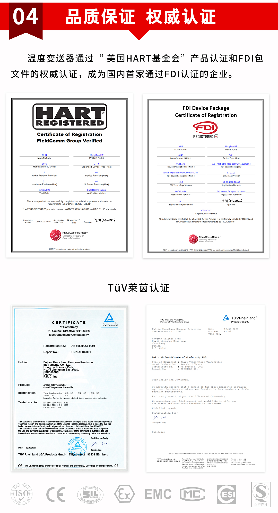 虹潤公司是專業(yè)生產溫度變送器的國家專精特新“小巨人”企業(yè)。生產的智能溫度變送器,具有適配各類溫度傳感器,精度高,通過編程線修改輸入信號類型及量程,高抗干擾,HART或485通訊等特點。該產品不僅通過HART基金會認證、德國萊茵 CE 認證與 SIL 功能安全認證,還獲得具備減震抗干擾能力的溫度變送器、信號隔離器、一種二端子模塊、無源信號隔離器等4項國家發(fā)明專利,主持起草物聯(lián)網智能溫度儀表、現場設備工具(FDT)接口規(guī)范、工業(yè)過程測量和控制系統(tǒng)用溫度變送器等3項國家標準,以及通信系統(tǒng)多通道數據采集控制終端規(guī)范軍用標準,參與國際5G標準制定,取得HART溫度變送器、智能溫度變送器等3項相關軟件著作權。產品廣泛應用于石油、化工、電力、冶金、制藥、食品、水處理等各種工業(yè)領域。