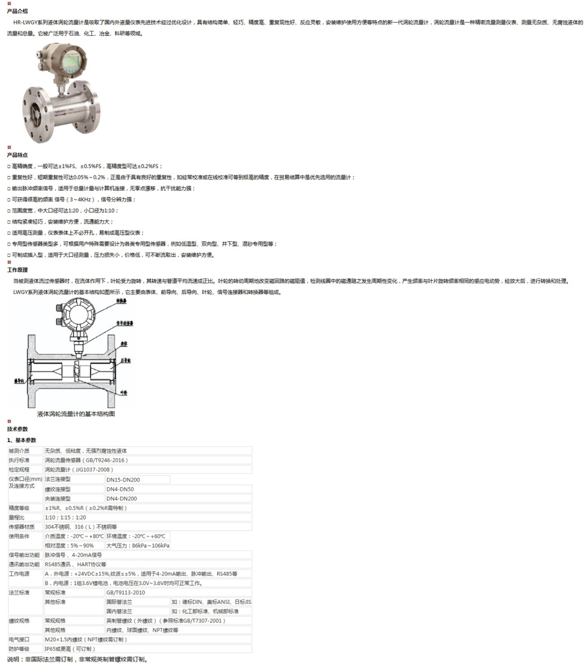HR-LWGY系列液體渦輪流量計是吸取了國內(nèi)外液量儀表先進技術(shù)經(jīng)過優(yōu)化設(shè)計,具有結(jié)構(gòu)簡單、輕巧、精度高、重復(fù)現(xiàn)性好、反應(yīng)靈敏,安裝維護使用方便等特點的新一代渦輪流量計,渦輪流量計是一種精密流量測量儀表、測量無雜質(zhì)、無腐蝕液體的流量和總量。它被廣泛用于石油、化工、冶金、科研等領(lǐng)域。